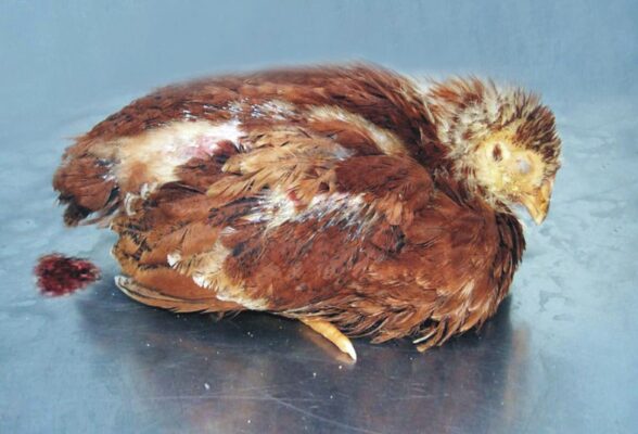 - Thể mãn tính: Gà giảm cân, xù lông, kém ăn nhưng không bỏ ăn hoàn toàn, đi lại khó khăn, chân yếu. Gà mái giảm đẻ, ảnh hưởng trực tiếp đến sản lượng trứng.